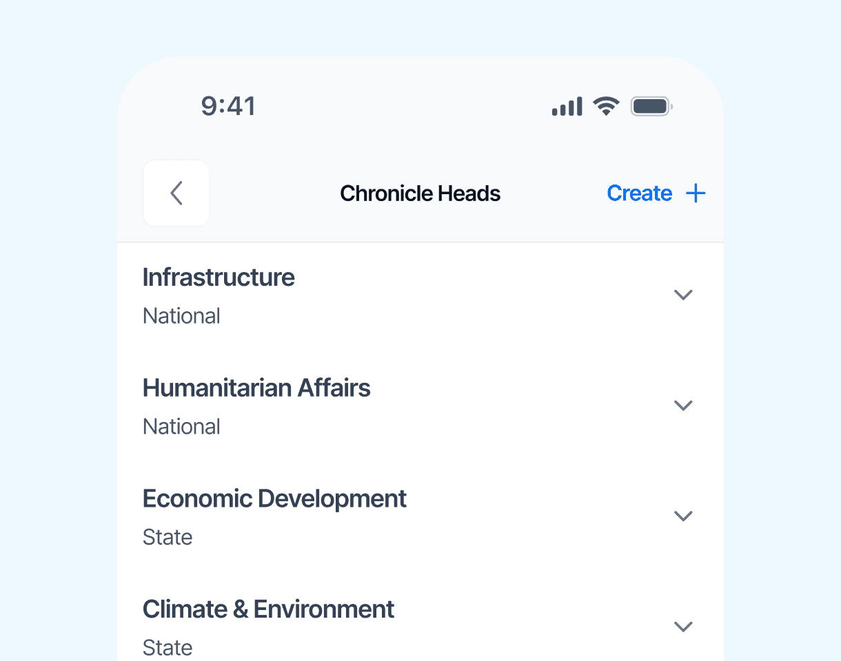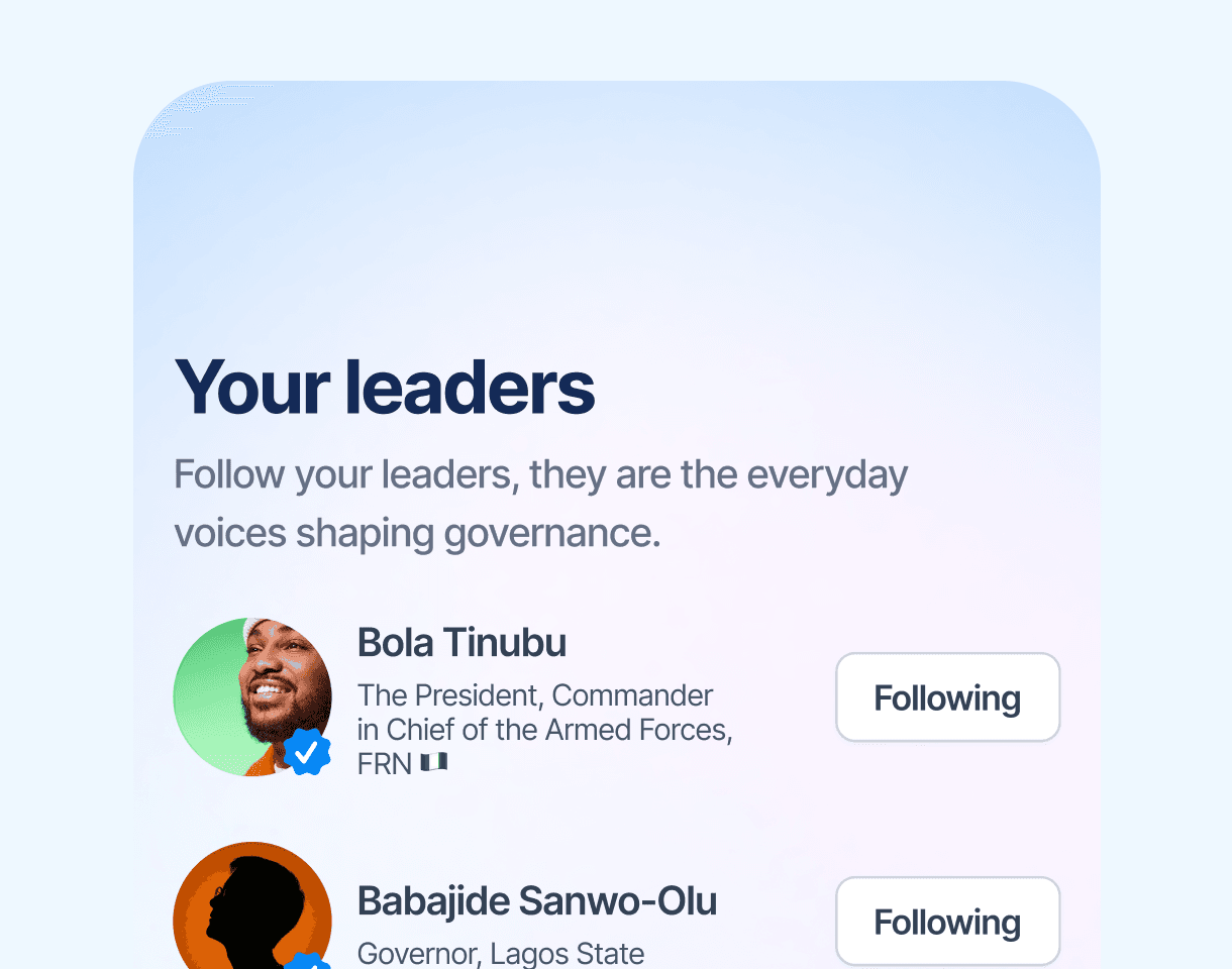 From the President down to your local government chairman, follow leaders across all levels. Each leader profile is verified and arranged by office, so your political awareness stays structured and accurate.